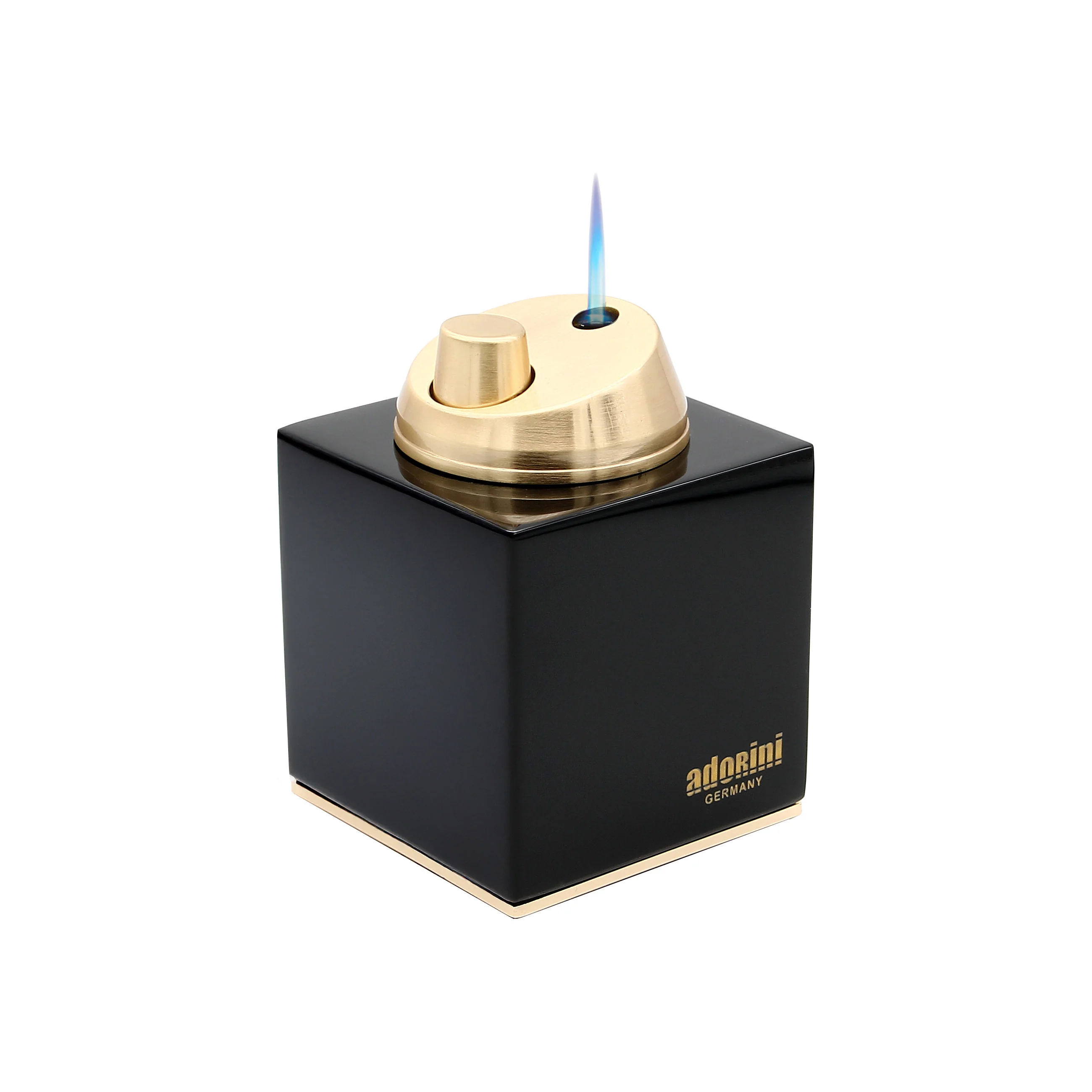 Această elegantă brichetă de masă adorini cu flacără tip jet combină modelul sofisticat cu utilitatea de înaltă calitate. Corpul ușor din lemn negru jet, lăcuit lucios îi asigură o prezență impresionantă, care este perfect accentuată de aprinderea aurie și de marginea decorativă aurie de la bază.