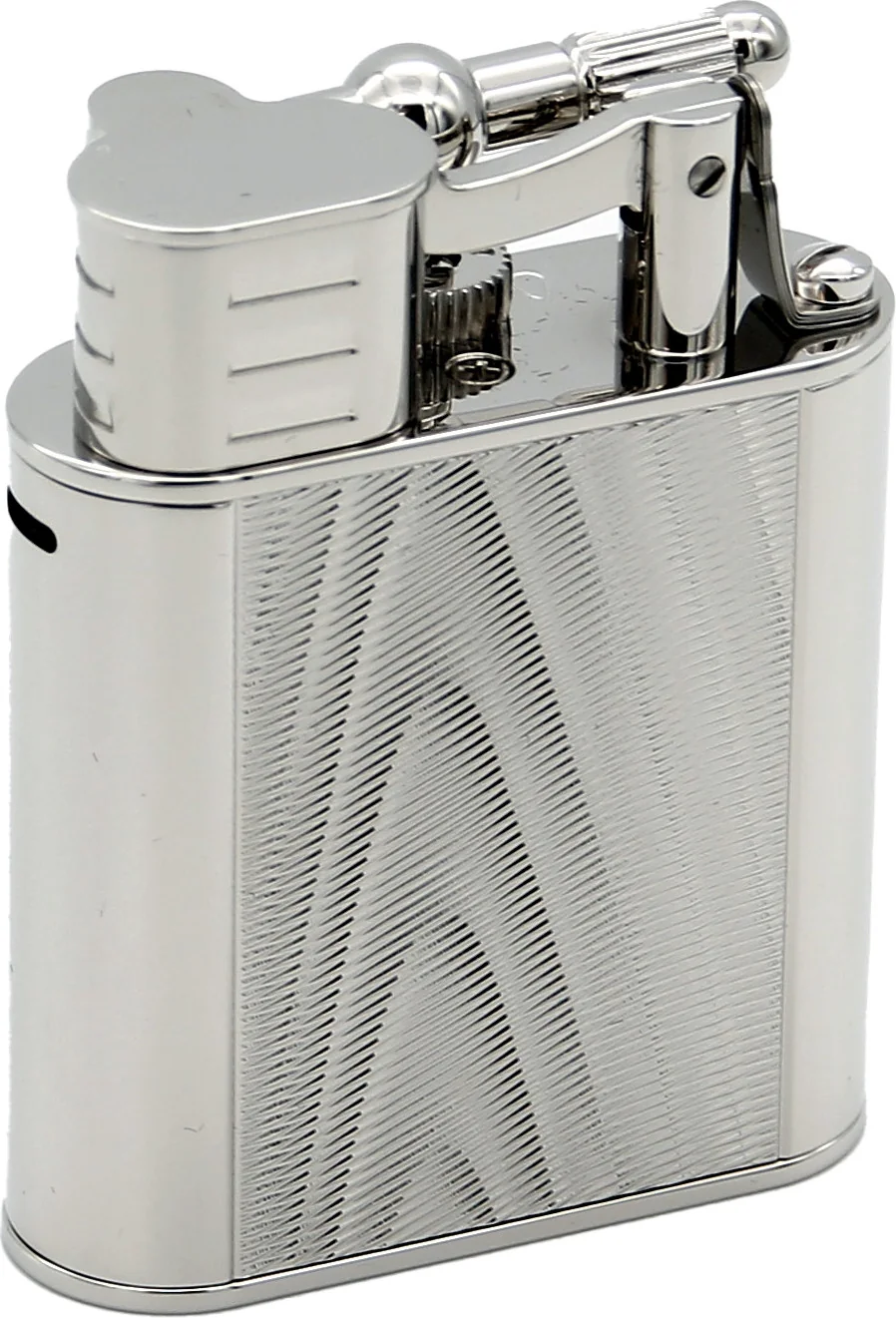 The elegant combination of moiré pattern and high-gloss surfaces creates an aesthetic overall appearance and makes the lighter a stylish accessory. A protective flap protects the ignition mechanism from dust and dirt. As soon as the flap is opened and the lever behind it is pressed down, a powerful blue jet flame unfolds.