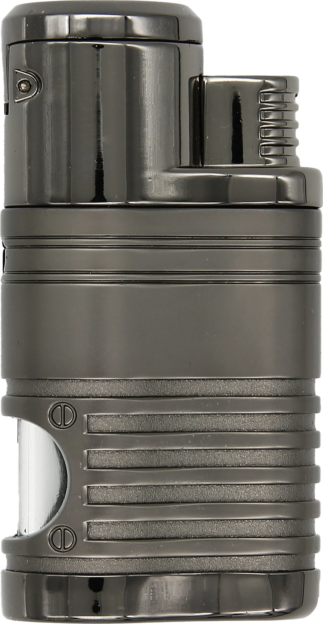 This lighter is beautiful. The window on the tank permits predicting easily when to refill. However, do not breathe or try to light your cigars outdoors. The slightest change in the wind (even soft) extinguishes the impressive but ineffective red flame. I had to buy a single jet, which is a REAL blowtorch, and really more efficient.