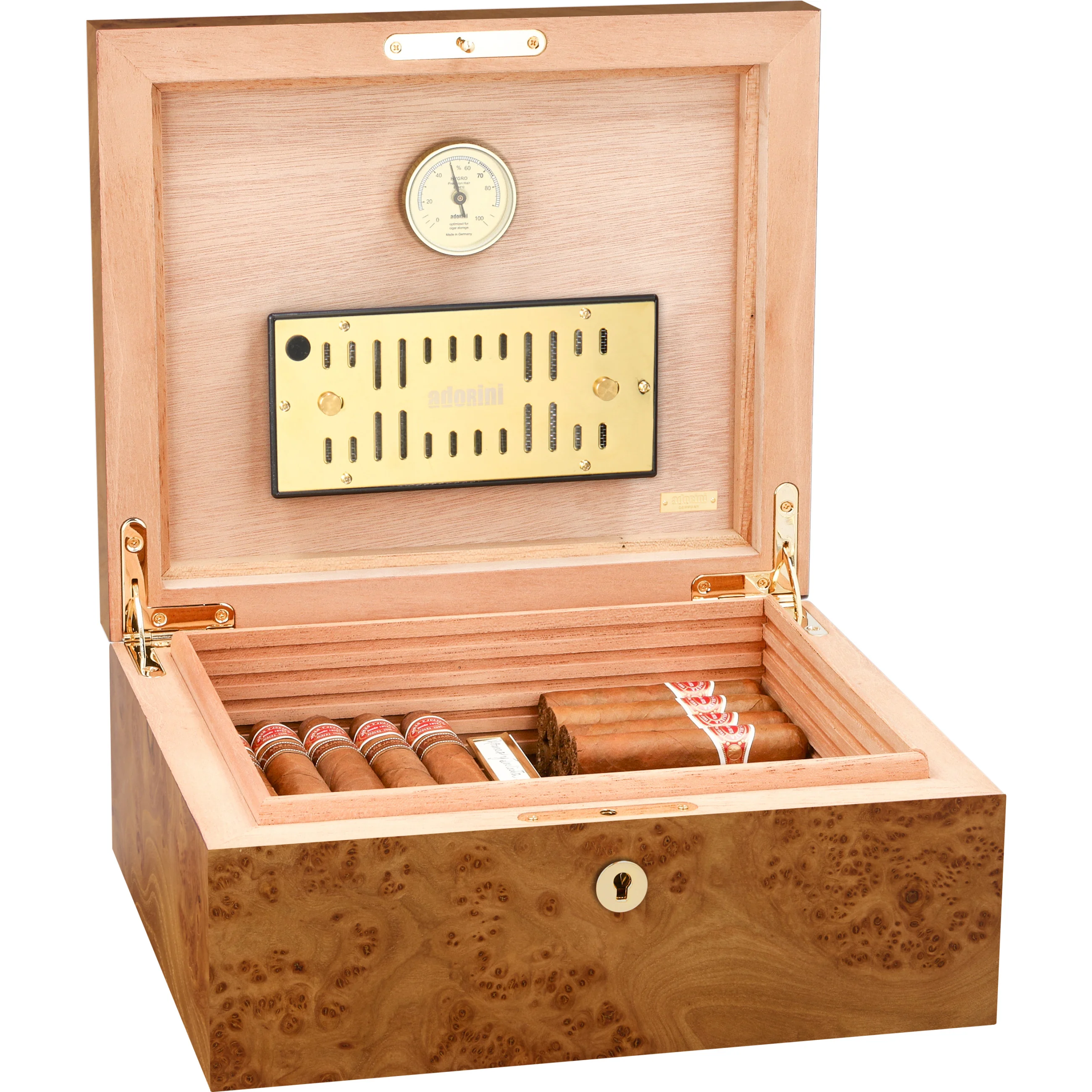 - Higrometru cu păr de înaltă precizie, precalibrat, optimizat pentru păstrarea trabucurilor