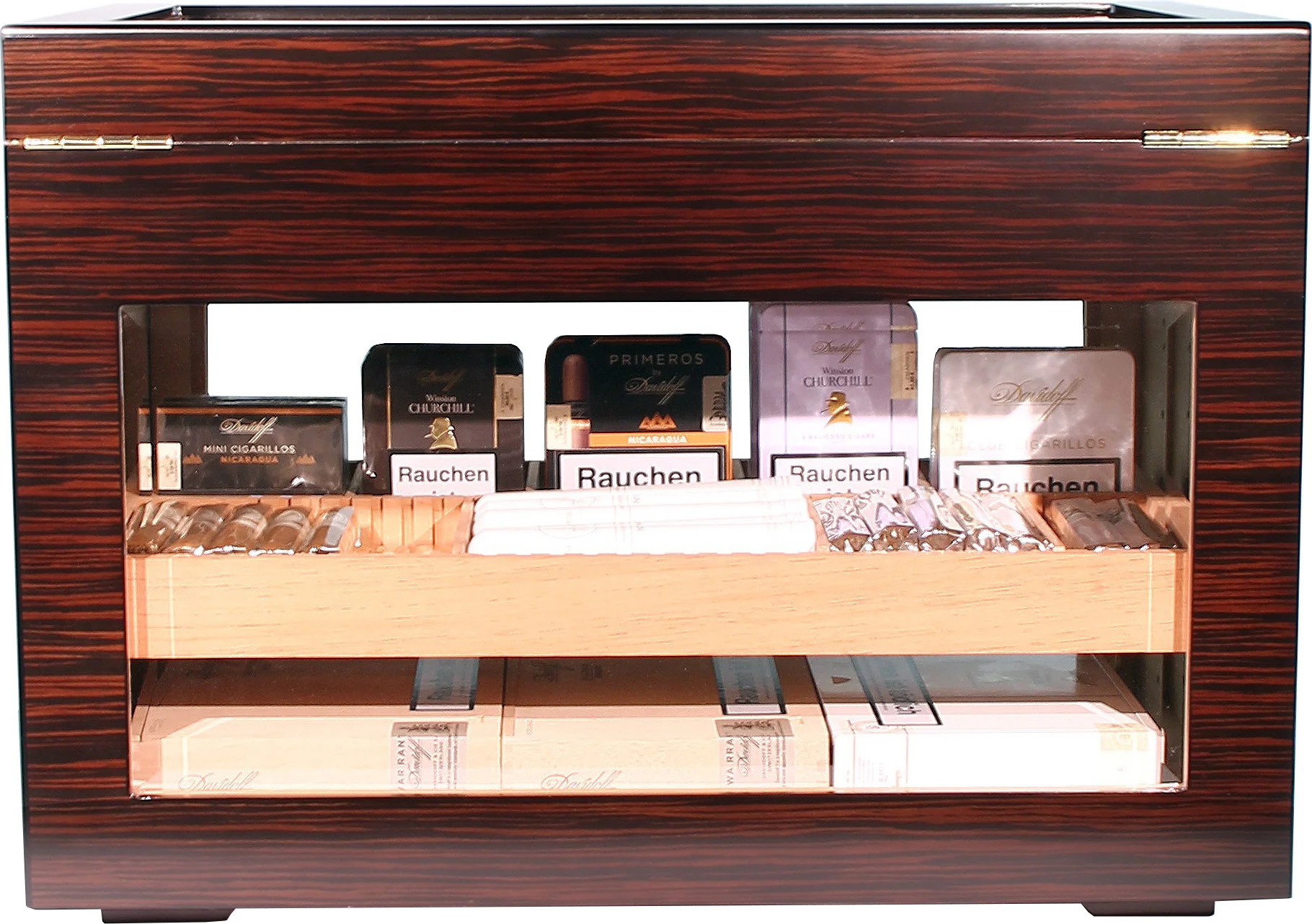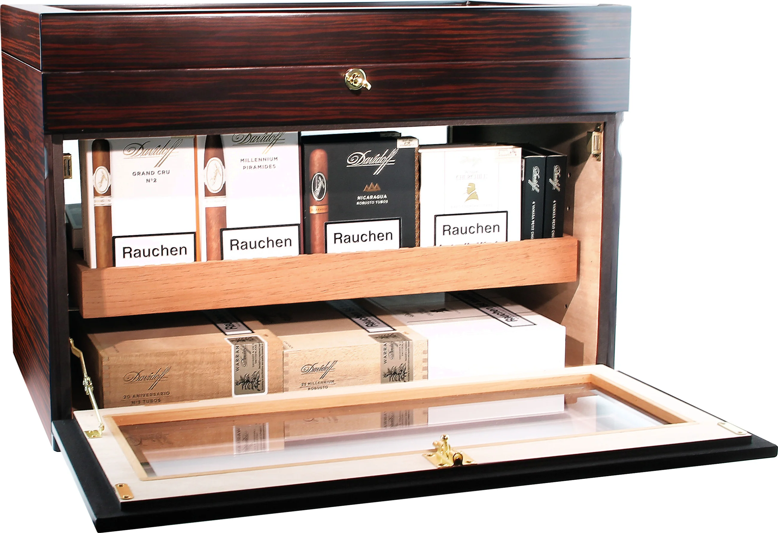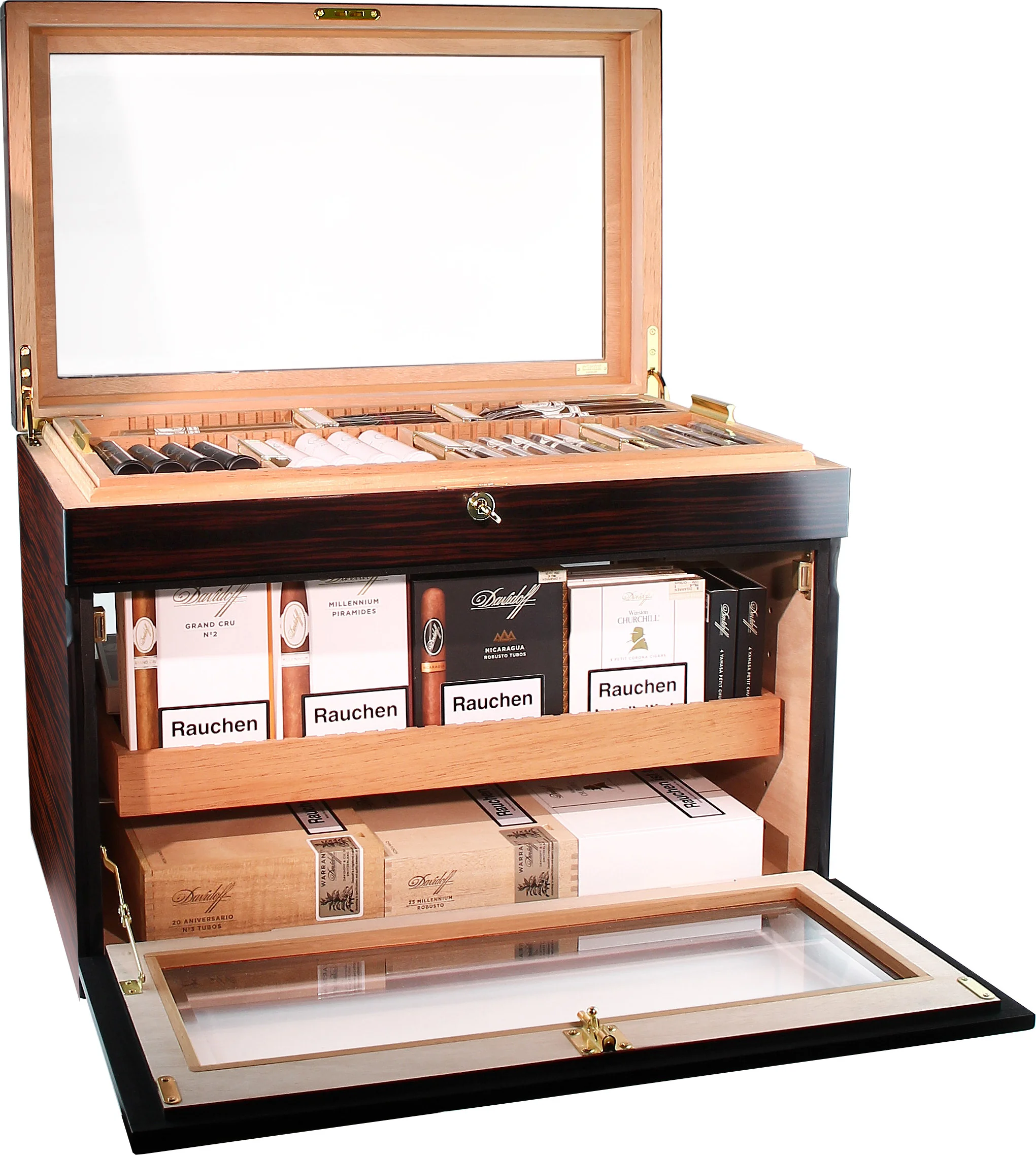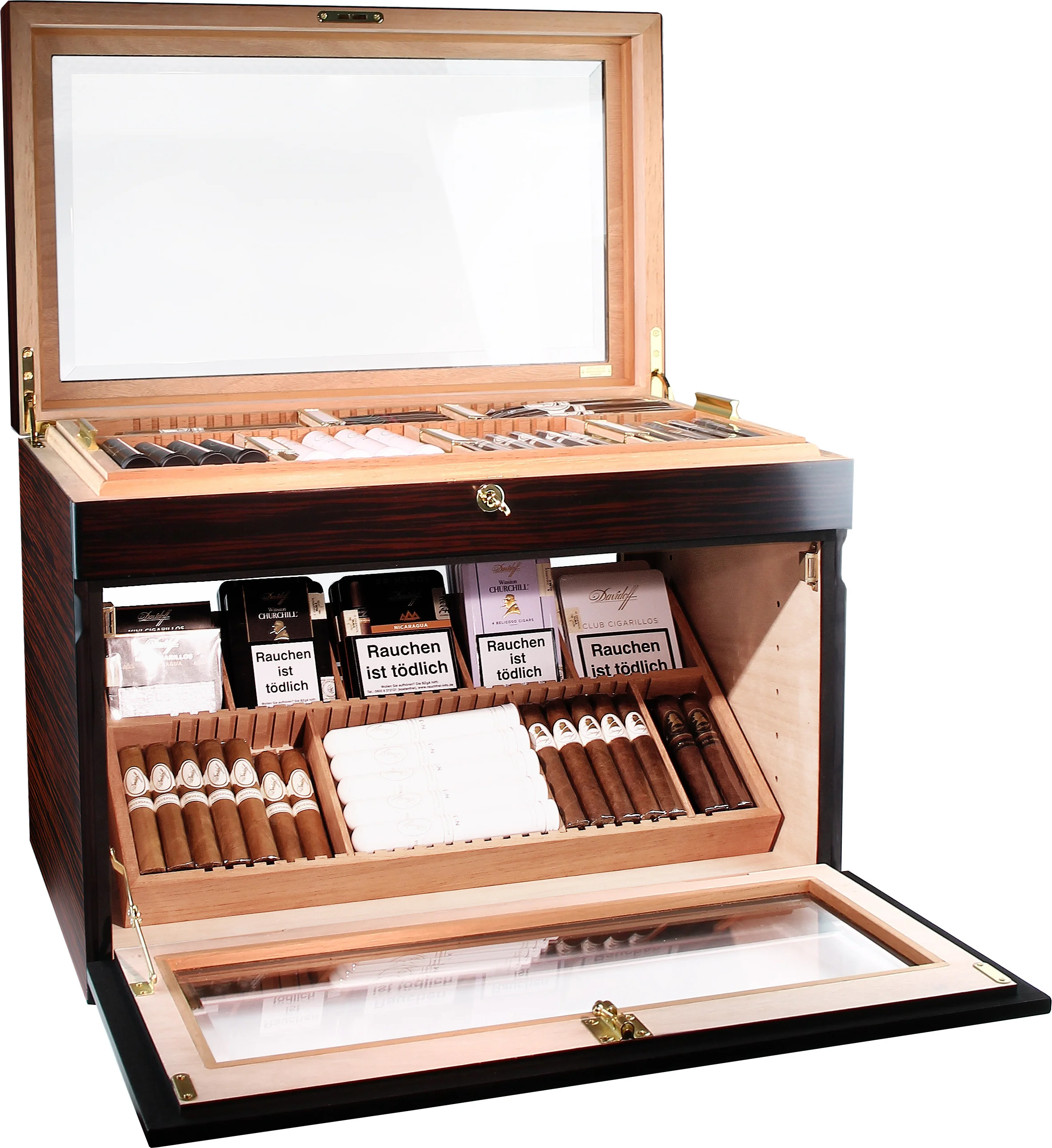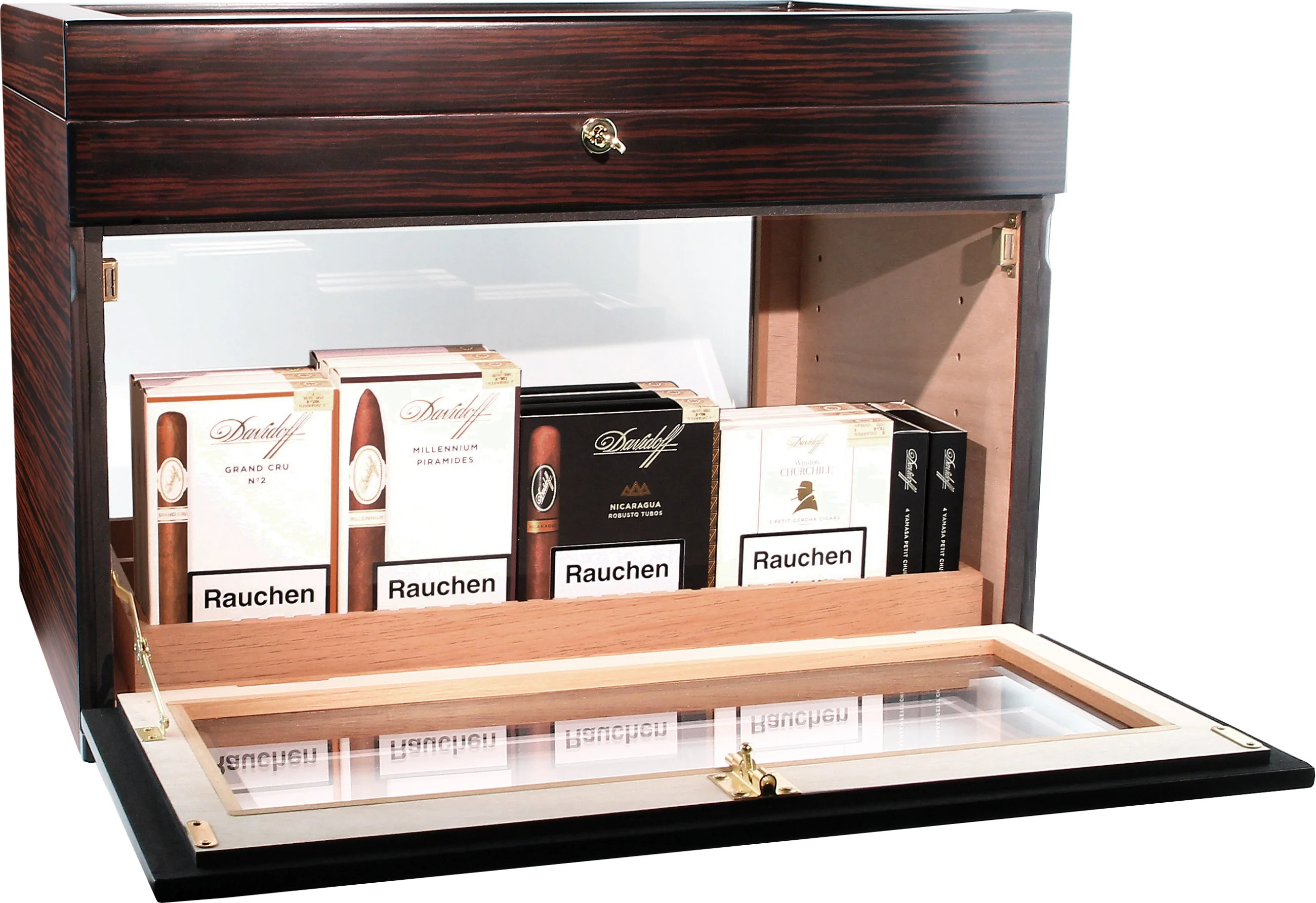- Optional trays for individual cigars and boxes can be inserted and optionally angled for optimal presentation.