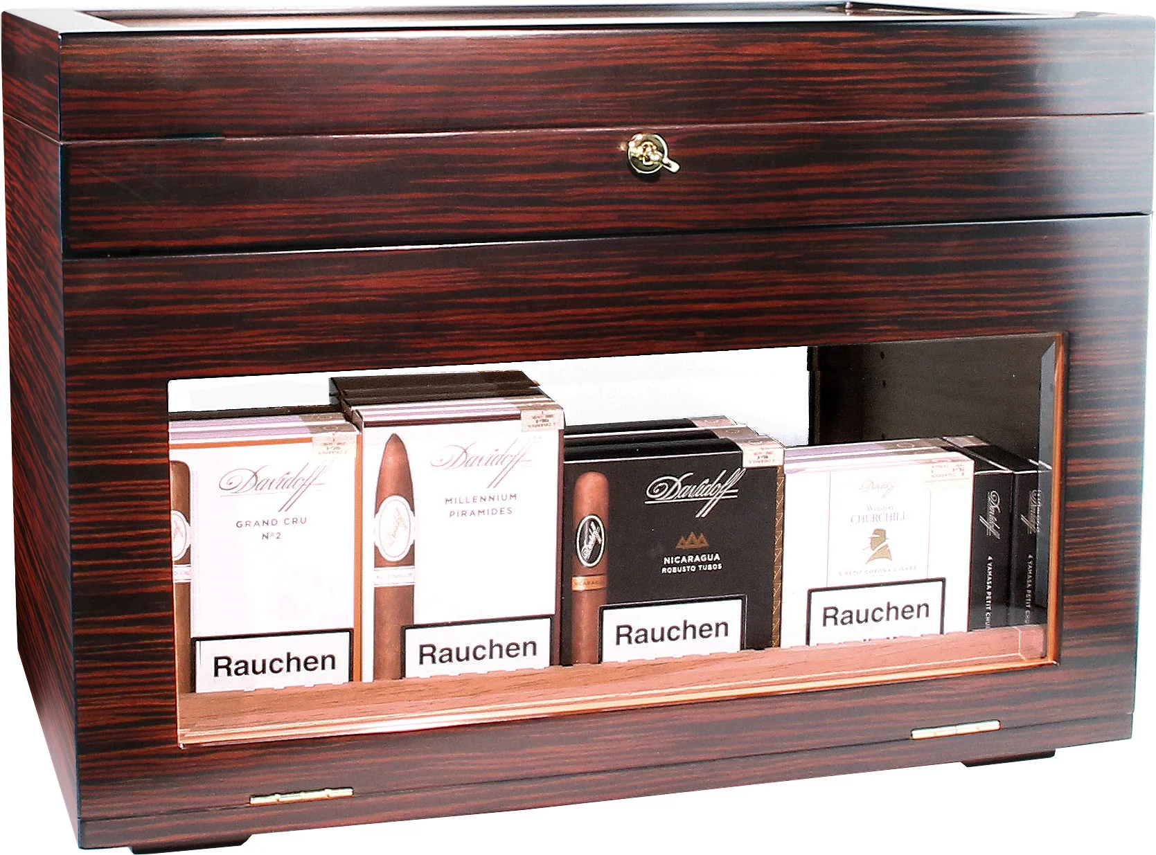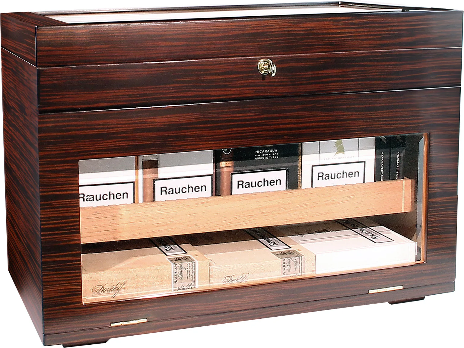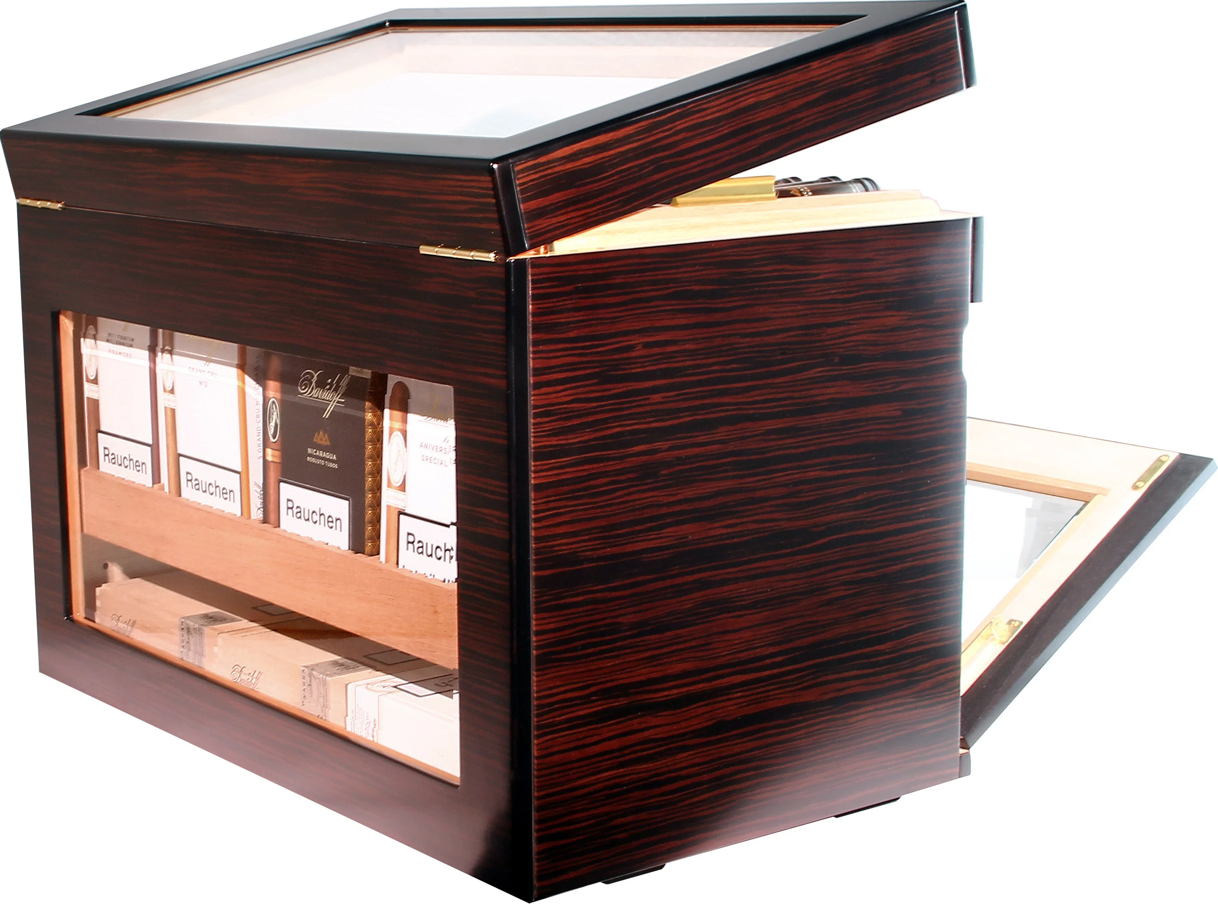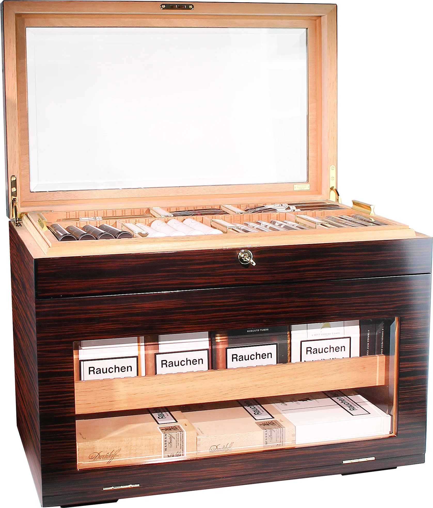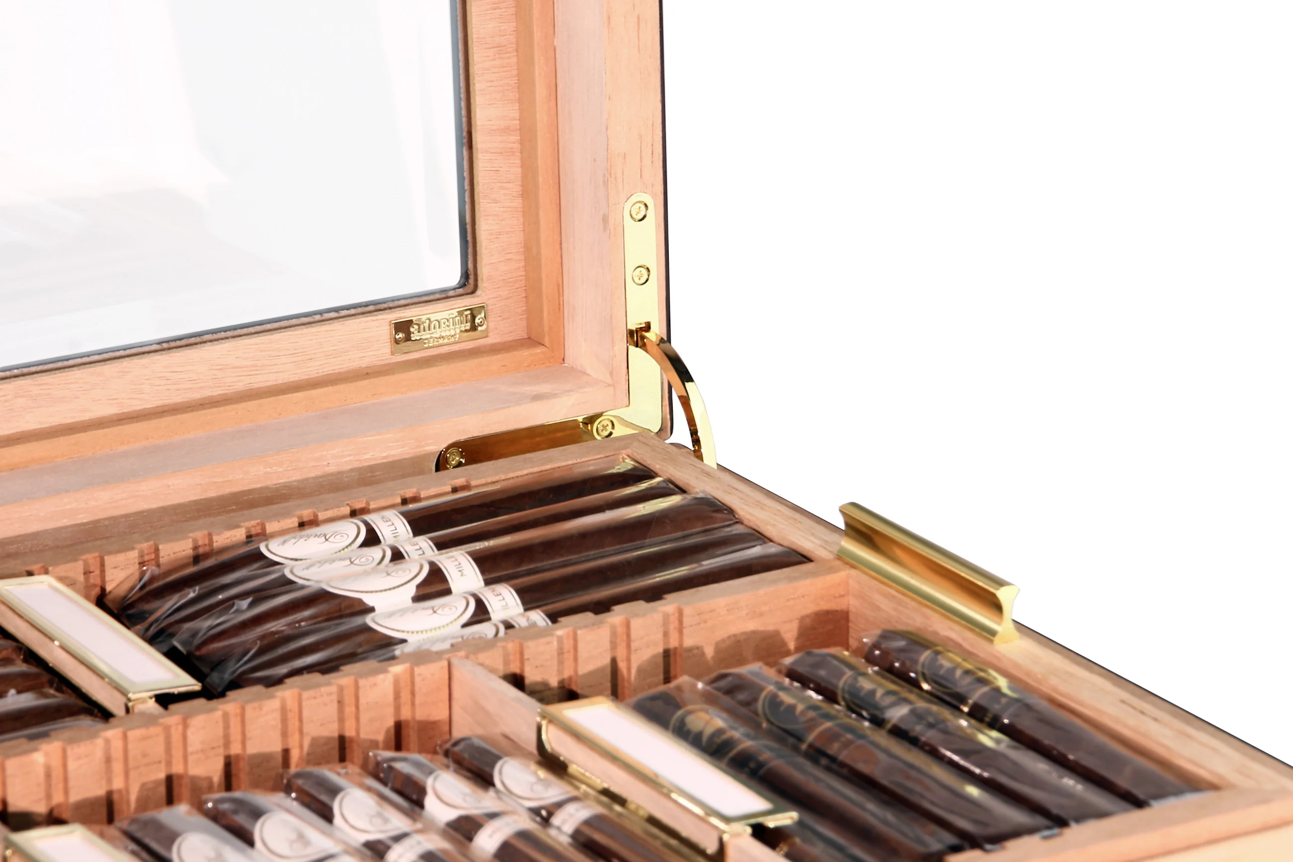 - Optional trays for individual cigars and boxes can be inserted and optionally angled for optimal presentation.