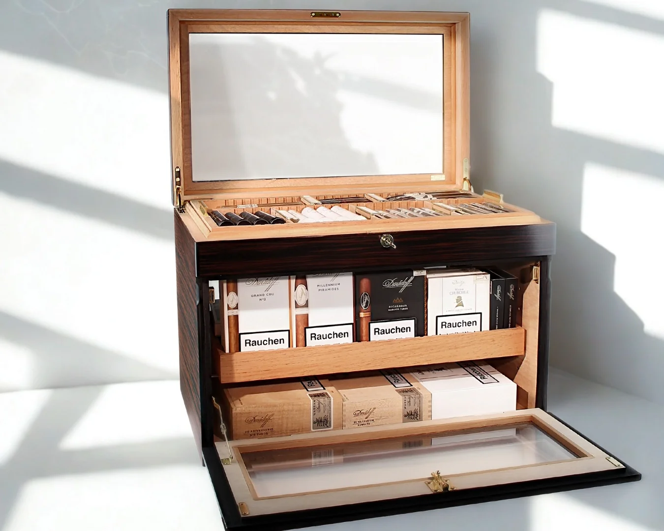 Multiple levels allow for the storage of individual cigars, boxes, or even entire cigar cases. The interior can be variably divided: