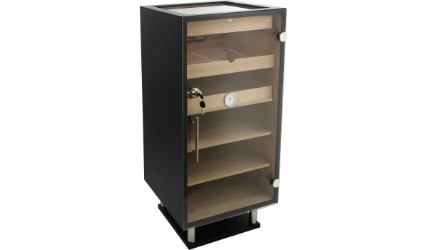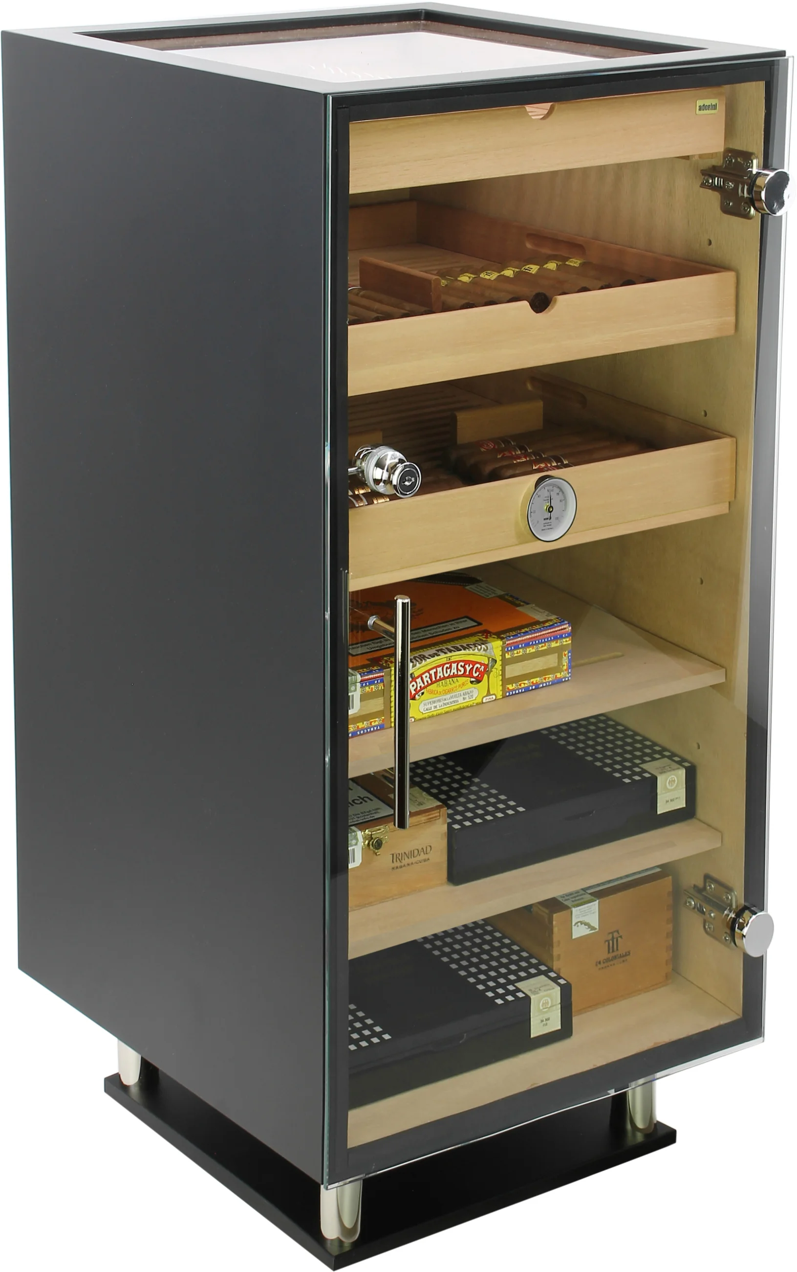 Fie că este pentru acasă, la birou sau în magazine, acest dulap cu picior, cu finisaj negru lăcuit, este ideal pentru a păstra până la 1200 de trabucuri de mărime Corona în stare perfectă, trabucurile fiind vizibile prin ușa de sticlă cu încuietoare sau prin panoul de vizualizare din sticlă din partea de sus a humidorului. Având în vedere flexibilitatea, echipa adorini a creat o mulțime de spații de depozitare căptușite cu furnir de cedru spaniol, care va găzdui atât trabucuri individuale, cât și în cutii. Tăvile detașabile și separatoarele cu cleme pentru etichete adaugă și mai multe opțiuni și ajută la păstrarea trabucurilor organizate pe până la 4 niveluri.