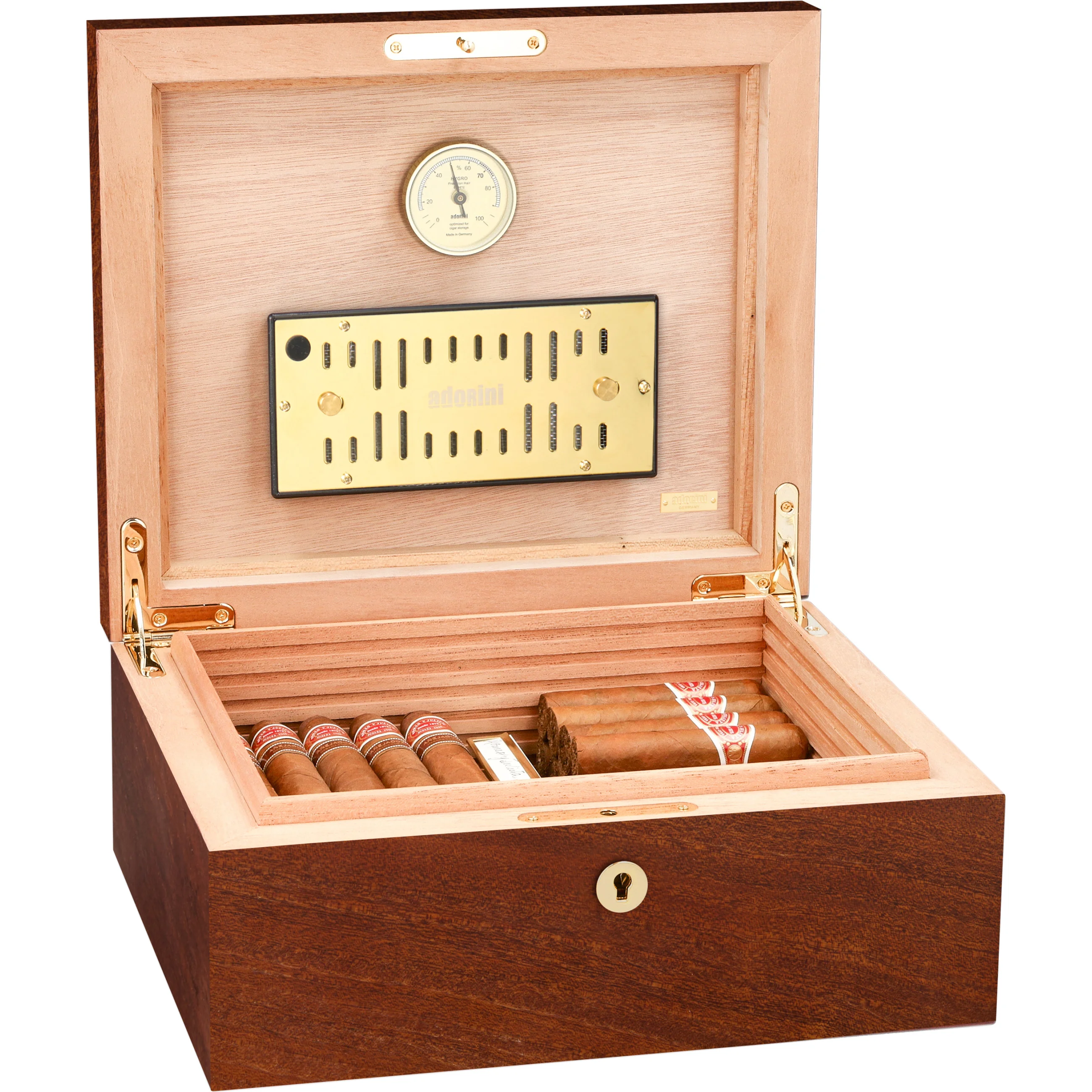 The adorini Humidor Siena Mahogany Medium Deluxe is an elegant medium-sized humidor that impresses with its attractive mahogany veneer. Slight variations in grain and color highlight the natural character of the real wood veneer and make each humidor unique.