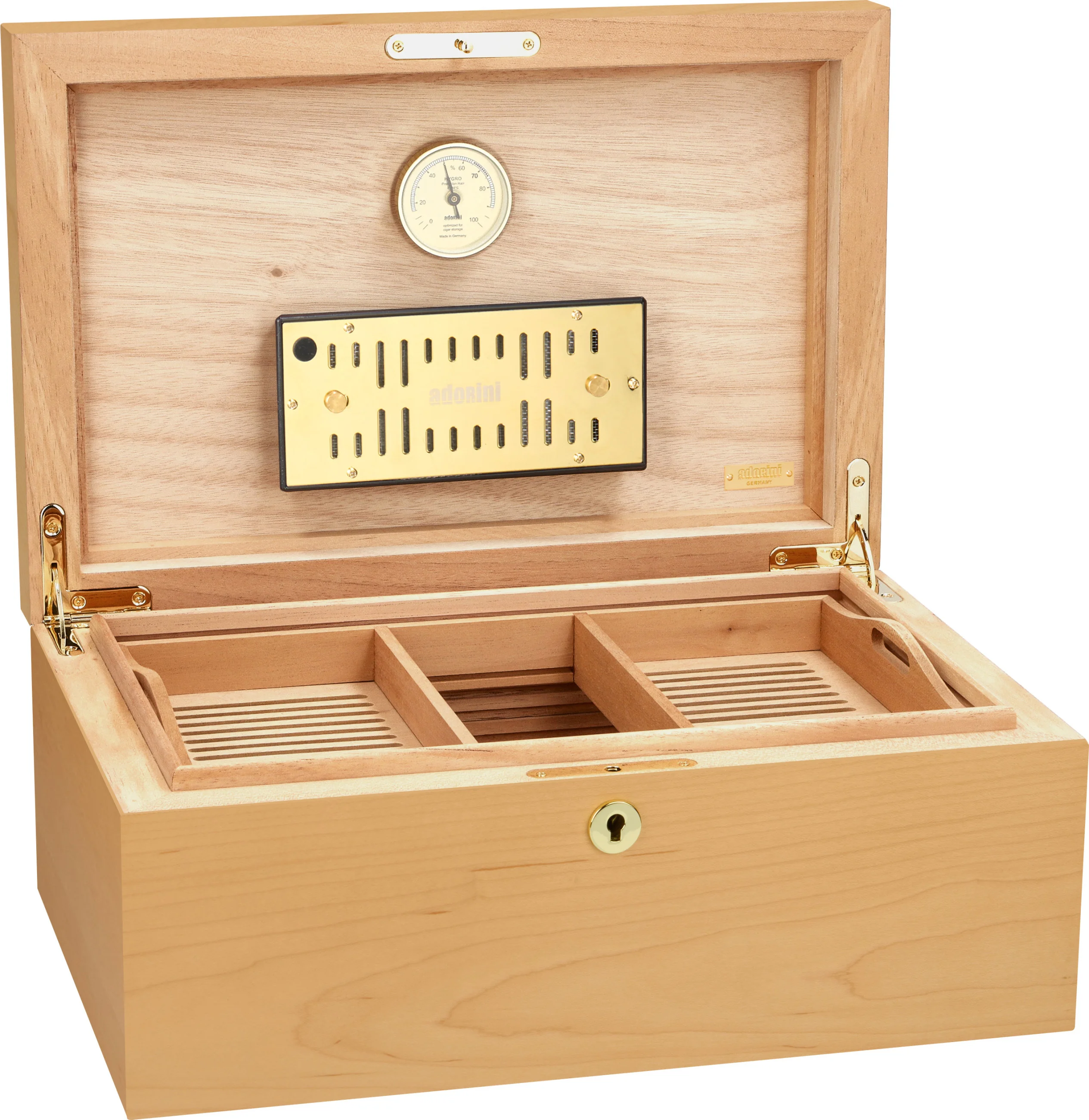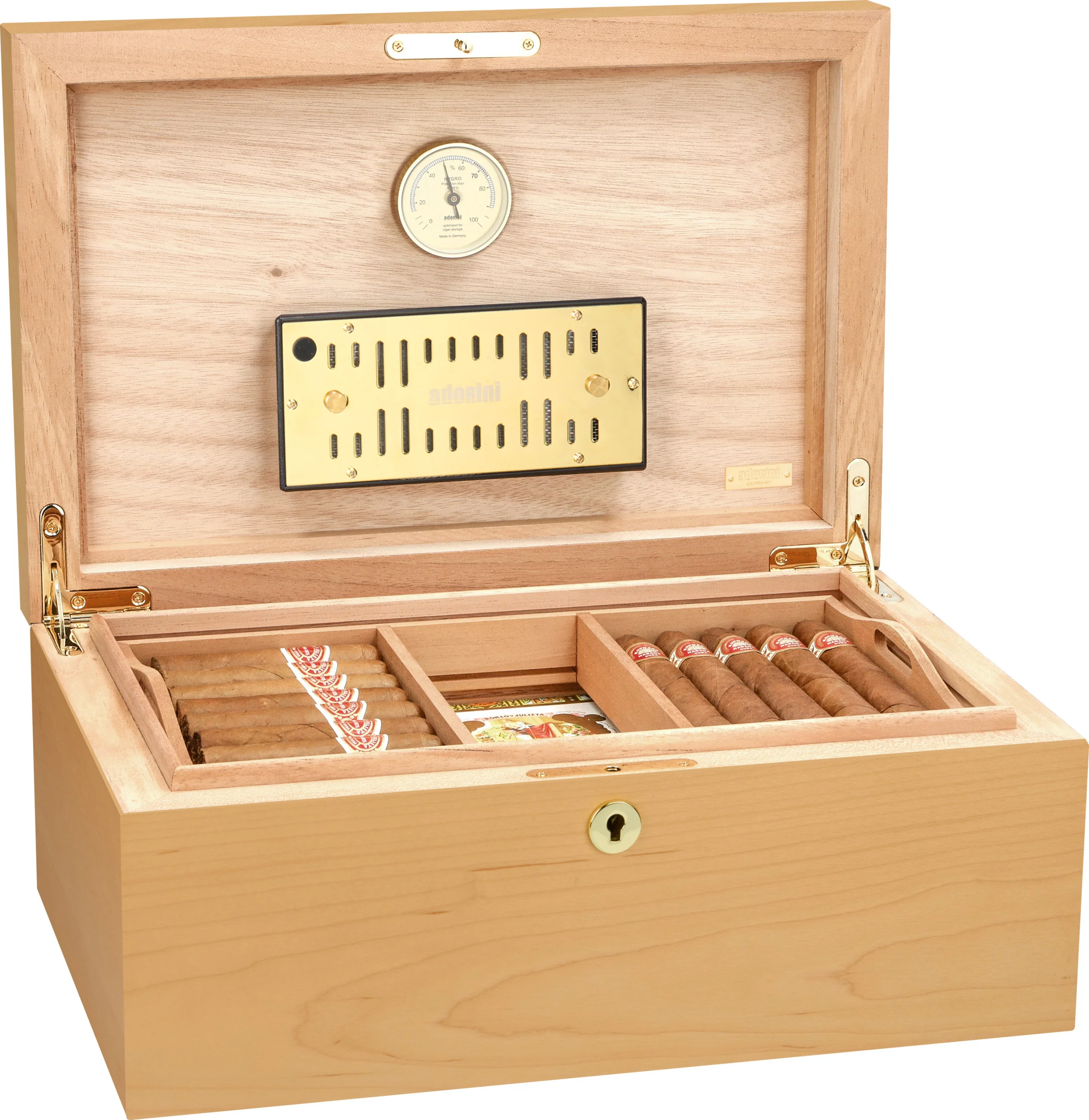 - Higrometru cu păr de înaltă precizie, precalibrat, optimizat pentru păstrarea trabucurilor