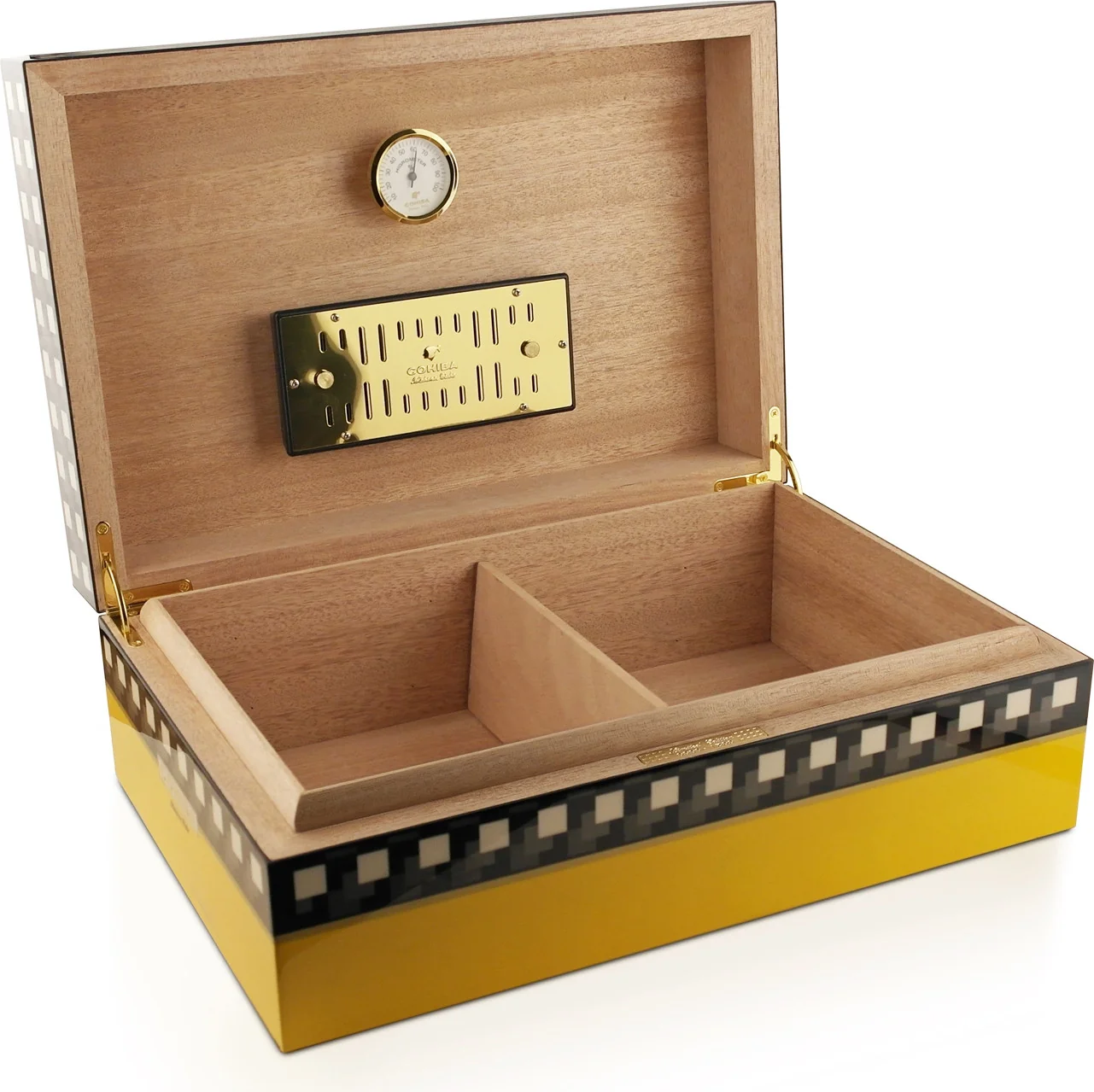 The humidor is presented in the unmistakable Cohiba colors of black, yellow, and white, which aficionados worldwide immediately associate with the brand. The Cohiba brand logo is prominently displayed on the lid. Upon opening, high-quality gold hinges are revealed, which are also embossed with the Cohiba name. Inside, there is a plaque indicating the individual limited edition number.