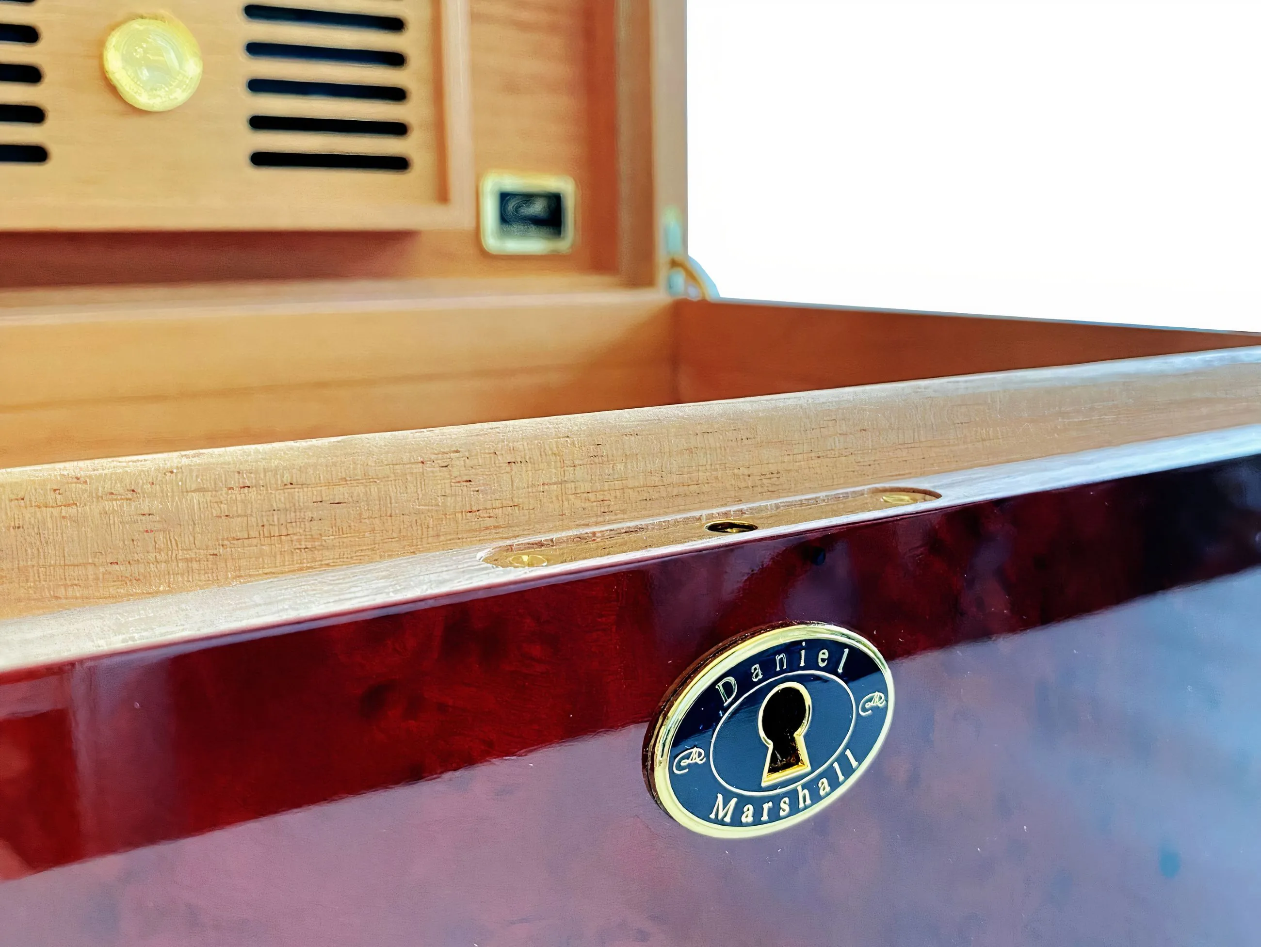 O plăcuță și un medalion cu semnătura Daniel Marshall pun punctul final de exclamare pe acest humidor superb, fiind o alegere minunată pentru orice cameră sau birou. Deși există multe produse disponibile pe piață în prezent, niciunul nu poartă eleganța sau prestigiul humidorului Daniel Marshall Burl Auburn.