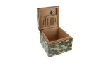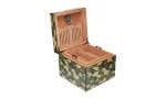- Humidor cubic modern cu un model de camuflaj deosebit și inscripții S.T. Dupont subtil imprimate pe partea din față a capacului.
