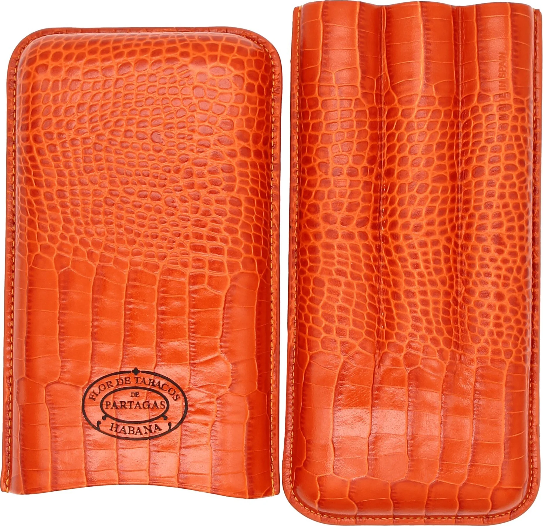 The Partagas Classic cigar case made of genuine leather in a striking orange is a luxurious accessory from the Cuban cigar brand Partagas. The finely embossed leather surface with a crocodile-like texture conveys an authentic look. The brand logo, unmistakably representing the Partagas brand, is prominently displayed on the front, giving the case an exclusive appearance.