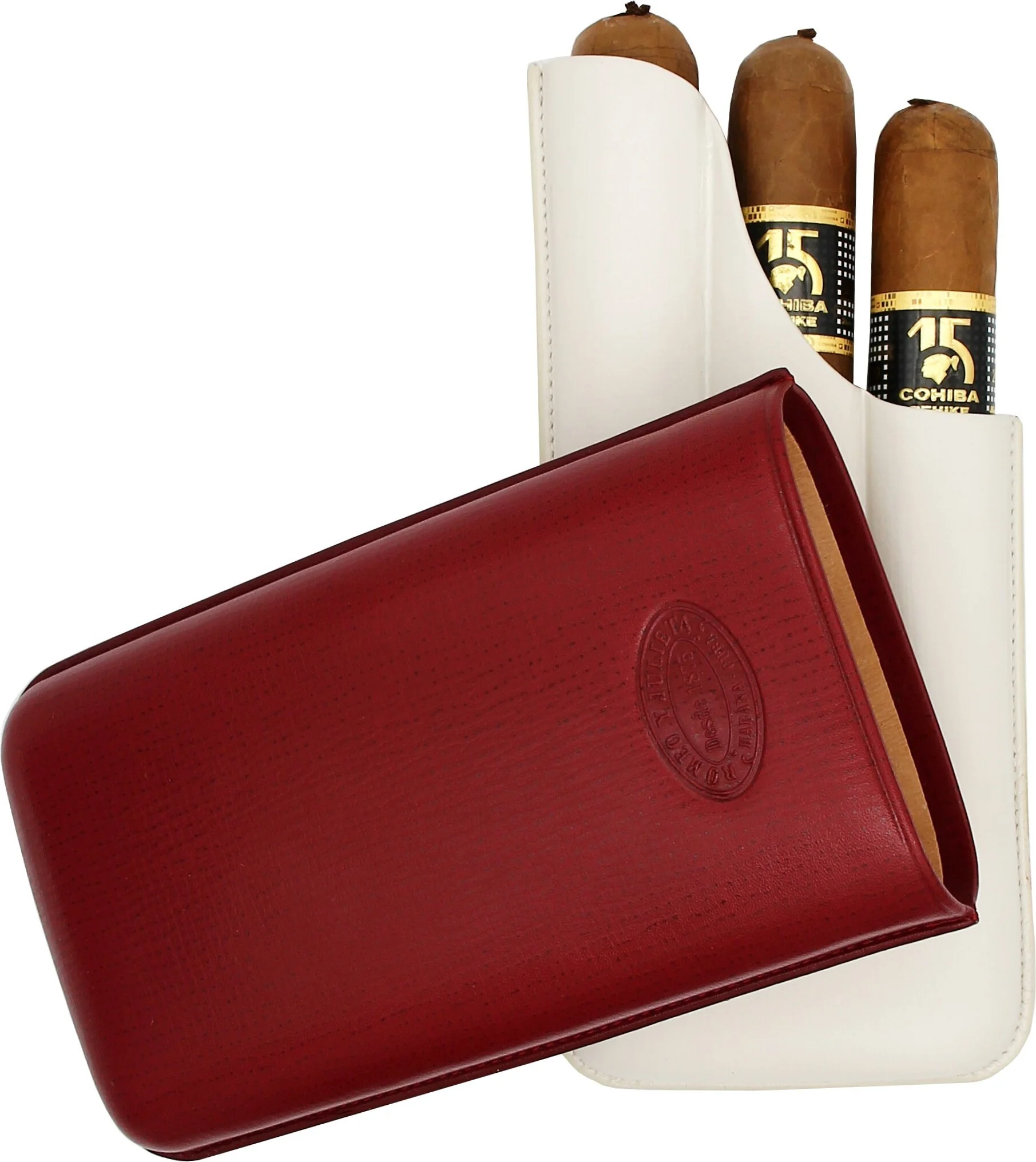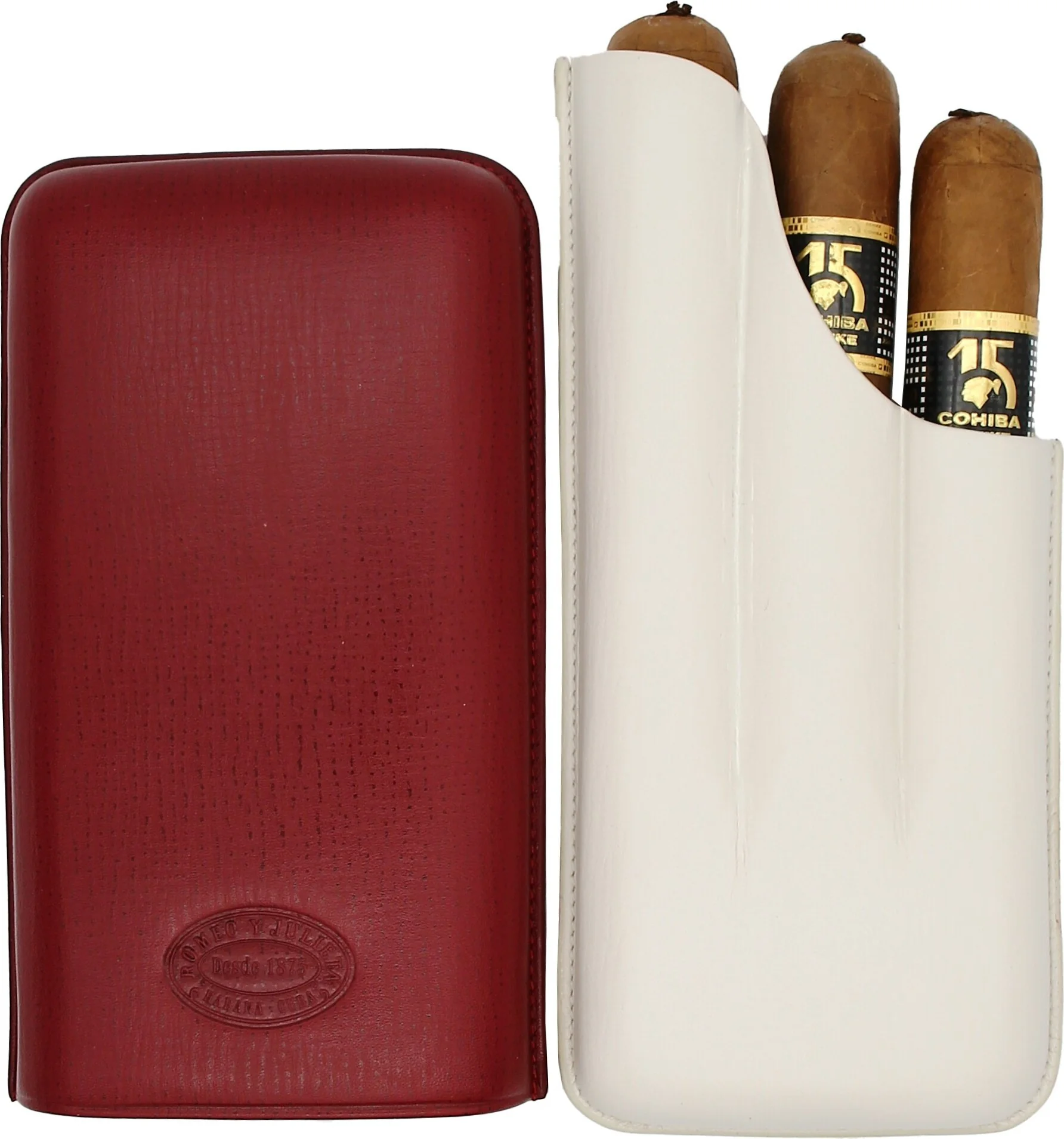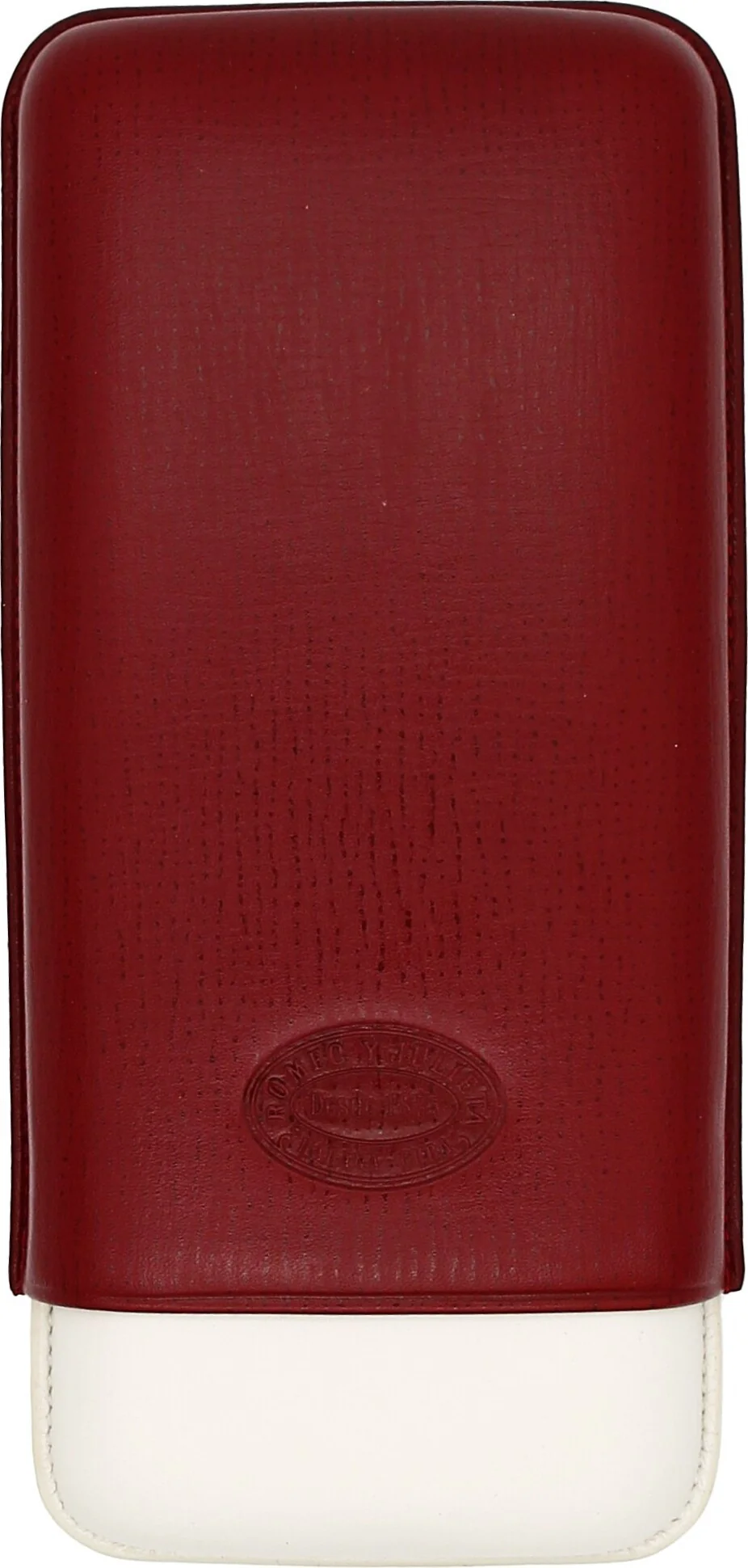 The Romeo y Julieta cigar case in elegant dark red with gray and white accents is a high-quality accessory from the long-established Cuban cigar brand. The finely textured embossing on the top and bottom gives the case an exclusive feel, while the embossed Romeo y Julieta logo on the front underscores its elegant brand identity.