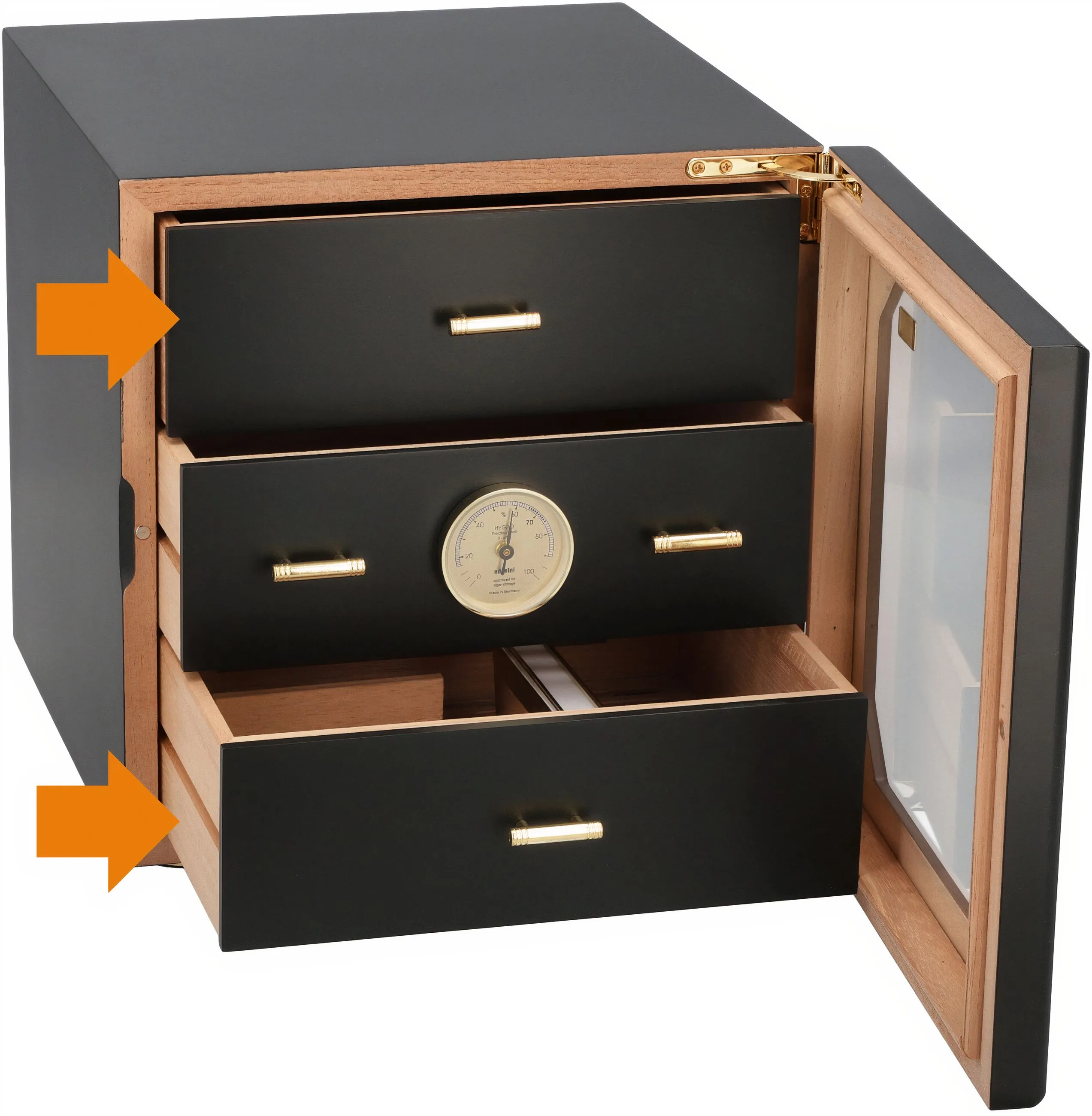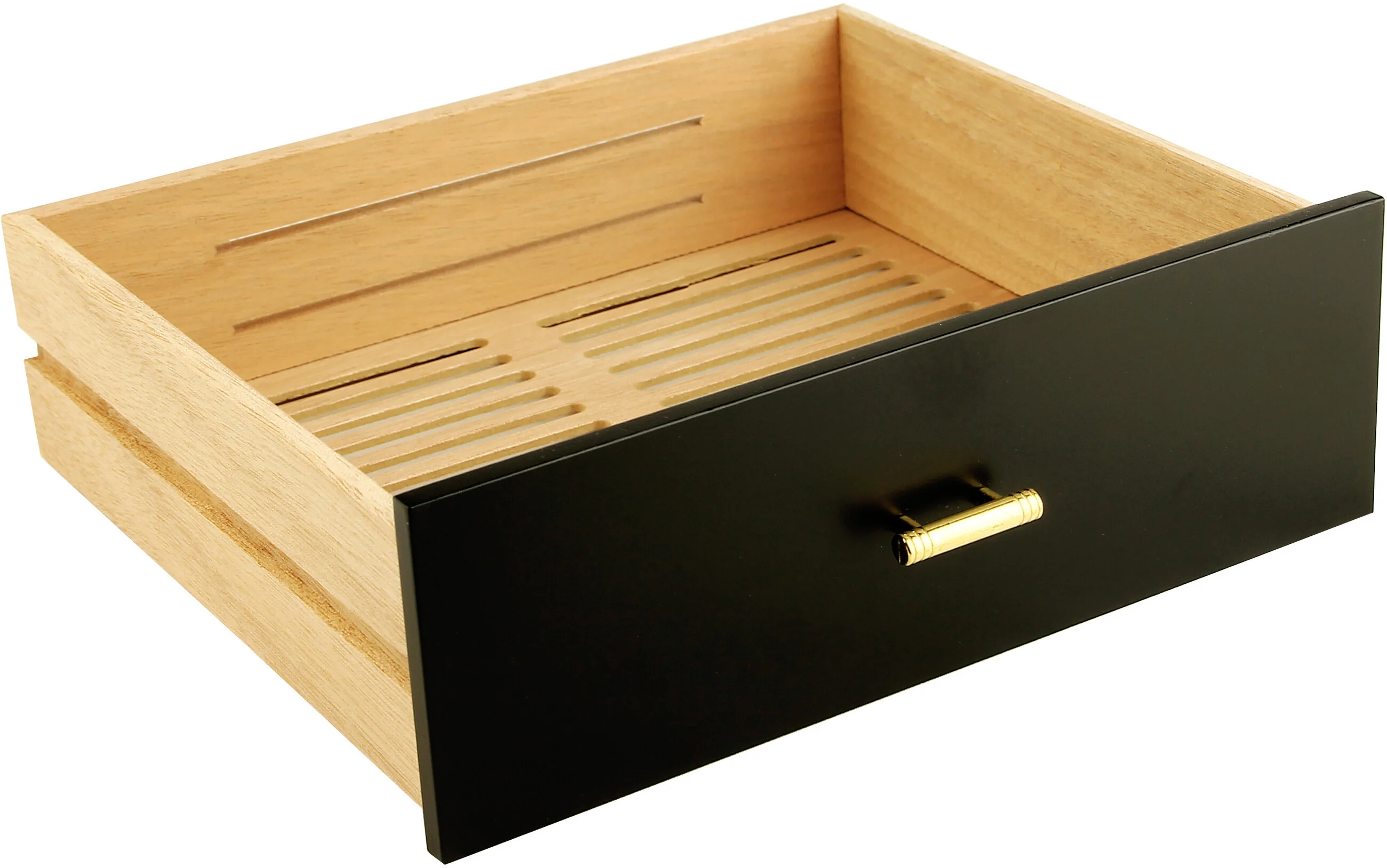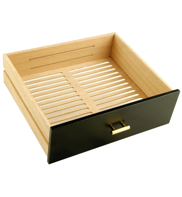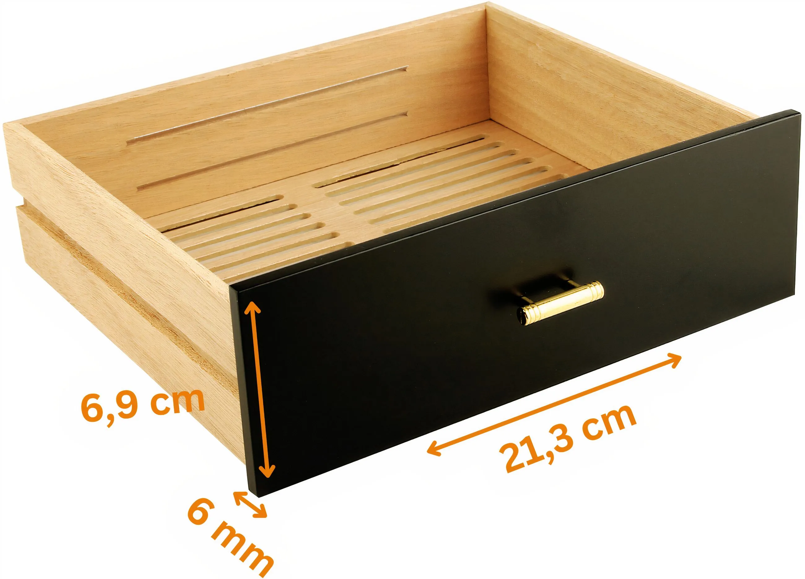 Sertar de înlocuire pentru humidorul adorini Chianti Medium Deluxe Reînnoiți-vă humidorul adorini Chianti Medium Deluxe cu sertarul nostru de înlocuire de înaltă calitate. El are o parte frontală neagră elegantă, care-i adaugă o estetică atemporală humidorului dvs. Carcasa sertarului este realizată din lemn de cedru spaniol aromat, renumit pentru condițiile optime de depozitare a trabucurilor. Mânerul auriu al sertarului nu este doar funcțional, ci îi aduce și o notă de lux întregului humidor. Contrastul dintre panoul frontal negru și mânerul auriu creează un aspect vizual atrăgător. Sertarul este echipat cu caneluri de ventilație, asigurând o circulație optimă a aerului, pentru a vă ajuta să vă mențineți trabucurile în condiții perfecte. Canelurile de ventilație facilitează distribuirea uniformă a umidității în interiorul humidorului, creând un climat ideal pentru maturarea trabucurilor dumneavoastră. Cu acest sertar de înlocuire, puteți nu numai să păstrați funcționalitatea humidorului dumneavoastră adorini Chianti Medium Deluxe, ci și să-i personalizați aspectul în funcție de preferințe. Bucurați-vă de măiestria de precizie, de materialele de înaltă calitate și de designul atent al acestui sertar de înlocuire, care vă oferă un spațiu perfect pentru depozitarea trabucurilor.