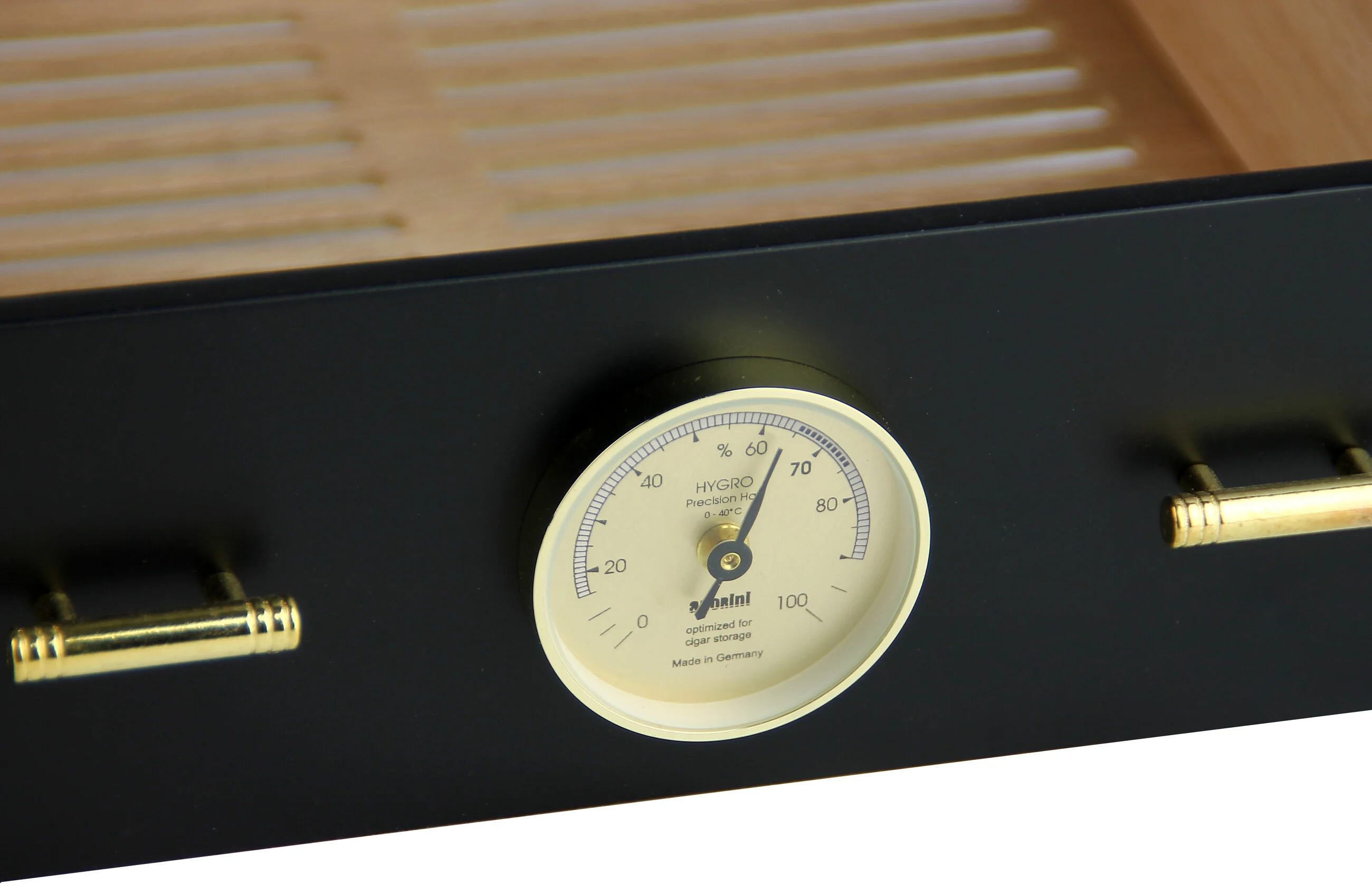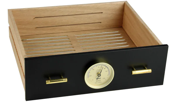 - **Design elegant:** Sertarul are mânere elegante aurii și partea din față neagră mată, oferindu-i humidorului un aspect elegant.