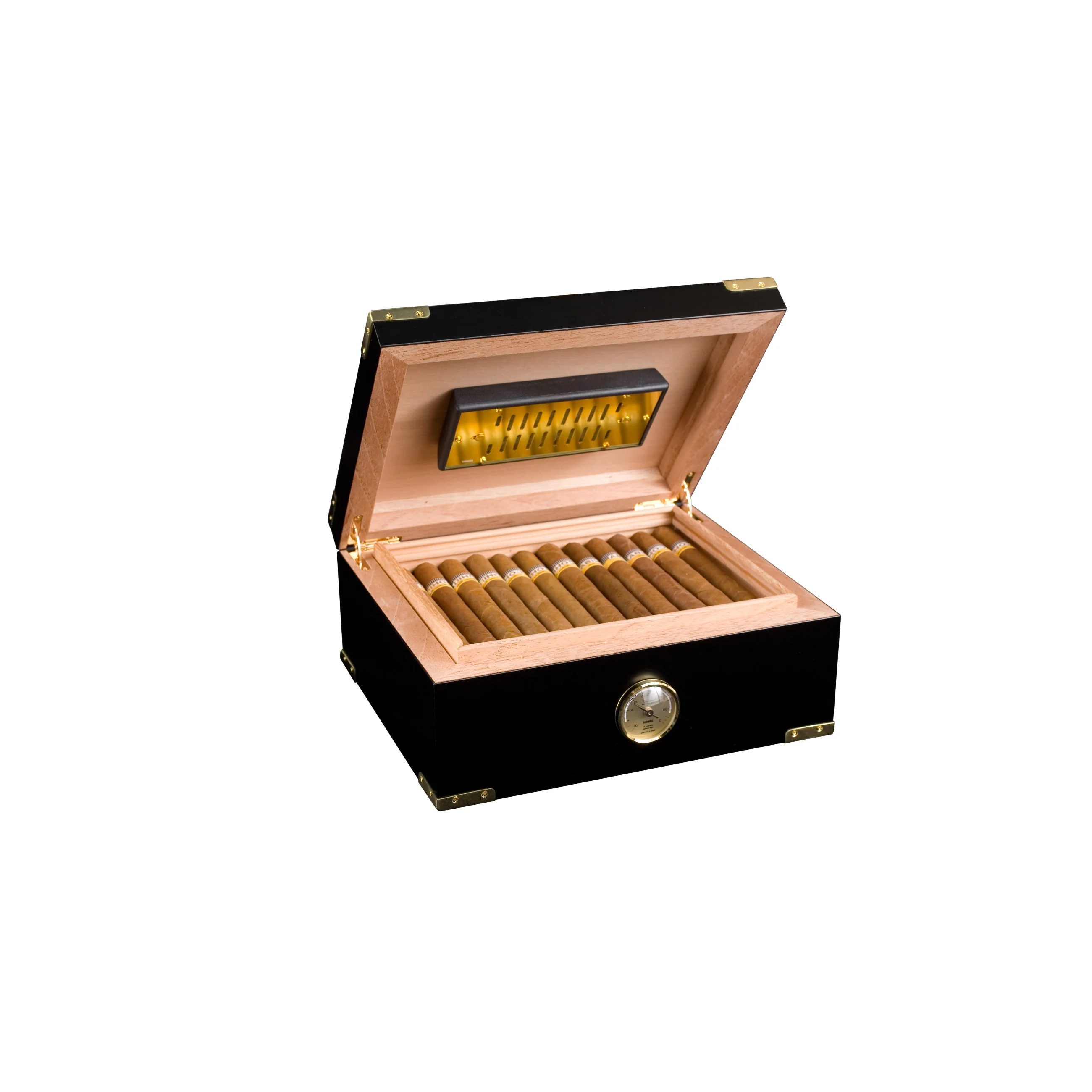 Menținerea umidității adecvate pentru până la 75 de trabucuri de mărimea Corona nu va fi niciodată o problemă cu umidificatorul de lux adorini pe bază de polimer acrilic, placat cu aur. Această bijuterie bine lucrată are deschideri de ventilație reglabile, astfel încât să puteți găsi nivelul perfect de umiditate pentru trabucurile. Umidificatorul este atașat de partea inferioară a capacului, prin intermediul unor magneți și a unei plăci metalice ascunse sub furnirul de cedru, pentru a optimiza și mai mult spațiul și controlul umidității.